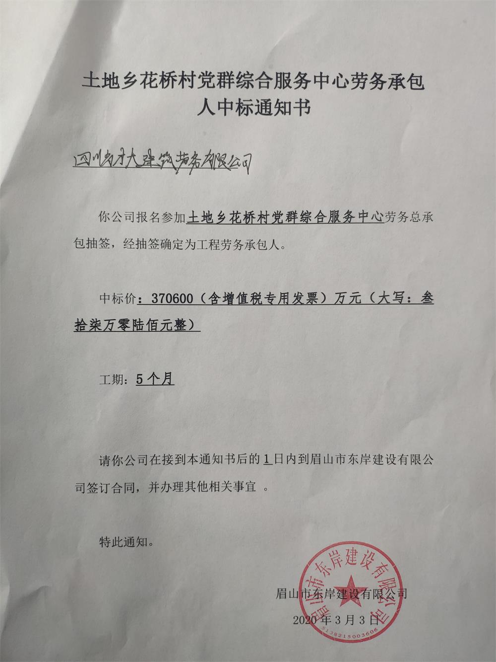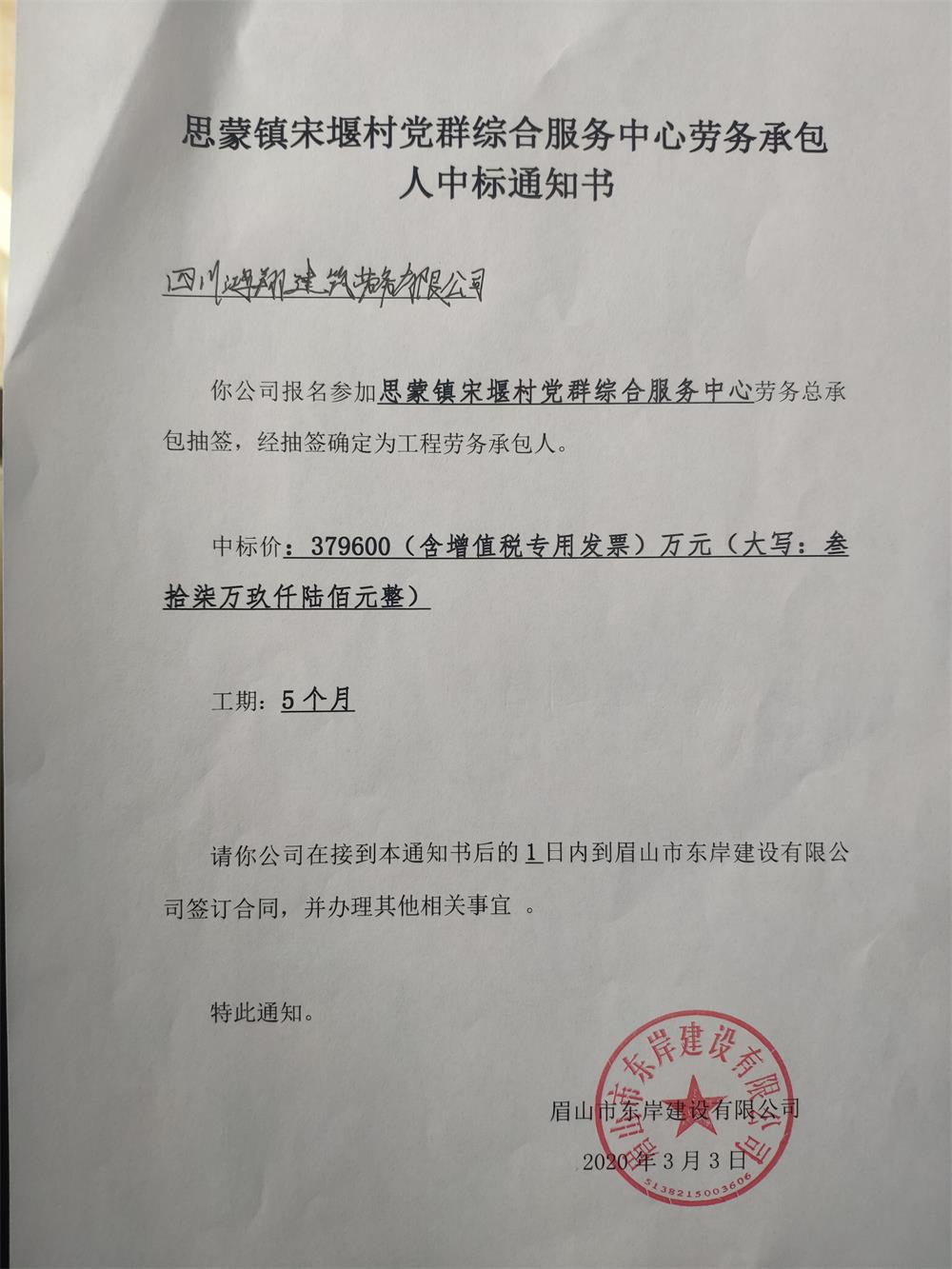 關(guān)于思蒙鎮(zhèn)宋堰村黨群綜合服務(wù)中心和土地鄉(xiāng)花橋村黨群綜合服務(wù)中心中標(biāo)通知