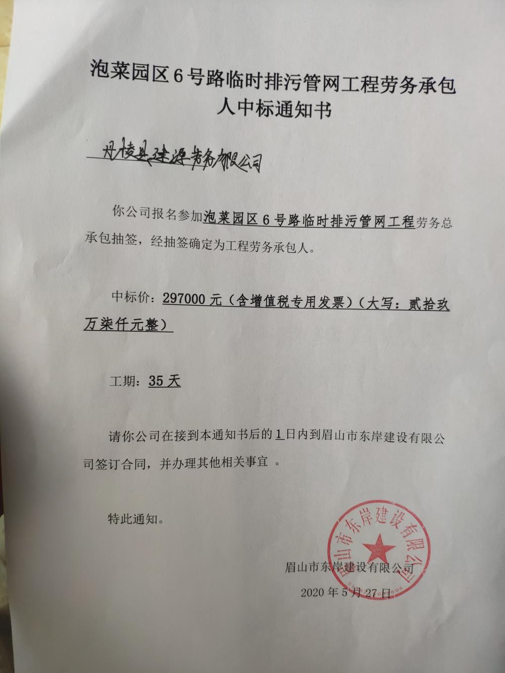 泡菜園區(qū)6號路臨時排污管網工程中標通知